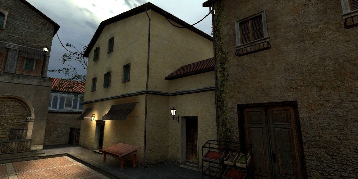 That is one of the simplest buildings in the map, but it looks pretty convincing. First of all it has a roof, smattering of windows, and a tall ground-floor. Also, there is paving all around, acting like a plinthe and cementing its position in the environment. The building isn’t just a square box with windows. Inferno is also an excellent resource, and takes things one step further.