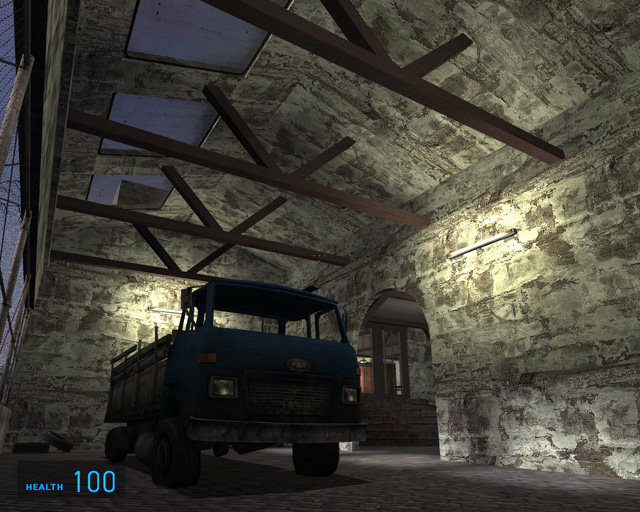 It still pains me to see such a large empty area. I would try to duplicate some of the lowered section (with the tanker) around here, to give it some variety and pull the staircase into play. Maybe giving the player access to the rafters could be fun. The ceiling too looks plain - more variation like arcing, destroying, cutting out or even lowering some bits would help break it up. It’s important to give an area like this a sense of purpose, and give its siblings (like the raised room on the left) some sort of personality too. The key is to make sure that they seem as alive as they are important to the gameplay.