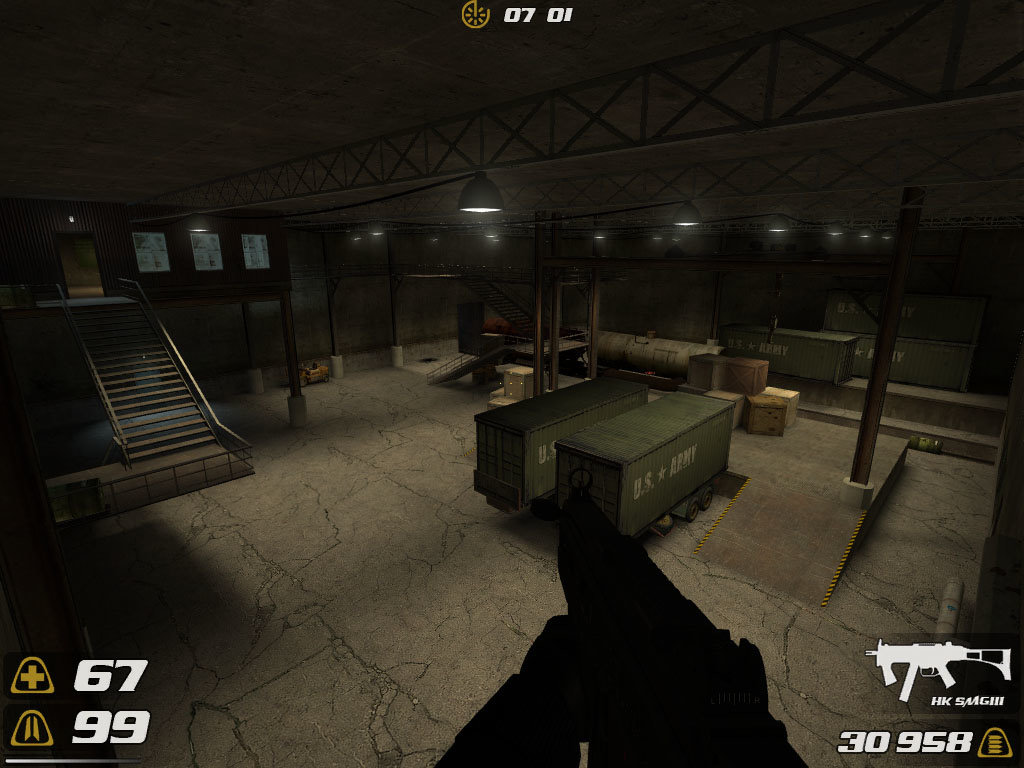 Finally, an indoor bit! This is looking pretty good. Immediately the ground texture jumps out as being a little too repetitive - a ‘flatter’ texture would work a lot better. I would also consider adding some cover near the base of the stairs, and also some stair supports (or the two could be combined.) The lighting is a bit uniform, simply breaking a few of the lights to create some darker patches would help a lot.