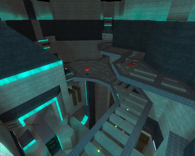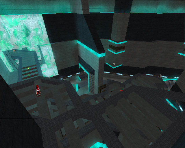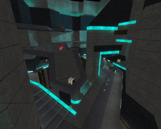The screenshot tells us two things: this map is very blue, uses no more than a handful of textures, and likes to show off it’s heritage. It’s very Q2-like. Because of this I’m going to ignore Q2’s dodgy surface lighting (notice the non-uniform uplighting) and only say that I think the lighting needs some more variety. I think.