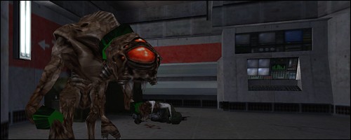 Outside behind a barricade are 4 soldiers and a Houndeye. Continue along and in the room with two army vehicles are 3 more Houndeyes, a dead scientist and dead soldier. Kill the ‘dogs’ and watch out because in the corridor on the far right is an Alien Grunt. You might want to sneak in at first to the right and try to launch a grenade or rocket at him while crouching behind the first vehicle. After toasting him, two Alien Slaves will teleport in. Take care of them then head to the left corridor (door on the right doesn’t open). At the end of the corridor is another Alien Grunt and a ladder on the left. I couldn’t seem to reach the ladder to climb it but if you can, there are boxes with health and bullets up top (used NOCLIP cheat to check it out).